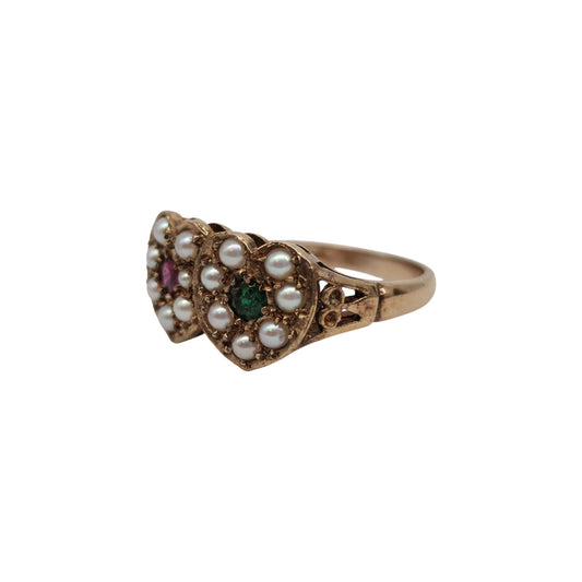 9ct 375 Yellow Gold Hearts Ring With Pearls Ruby & Emerald 1976 Size M 3.3 g.