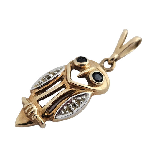 9ct 375 Yellow Gold Owl Pendant with Sapphire Eyes & Diamond Chips 1992