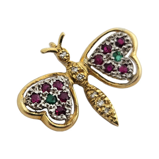 18ct 750 Yellow Gold Butterfly Pendant with Ruby, Diamonds & Emeralds 1982 1.9 g