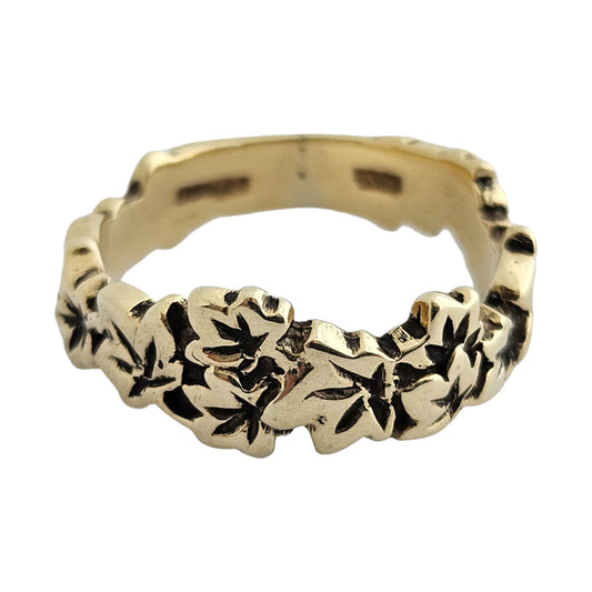 18ct 750 Yellow Gold Band Ring with Leaf Decoration 1992 Size M 5.4 g
