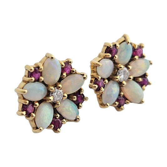 18ct 750 Yellow Gold Flower Shaped Ear Studs with Opals, Ruby & Diamond 7.3 g