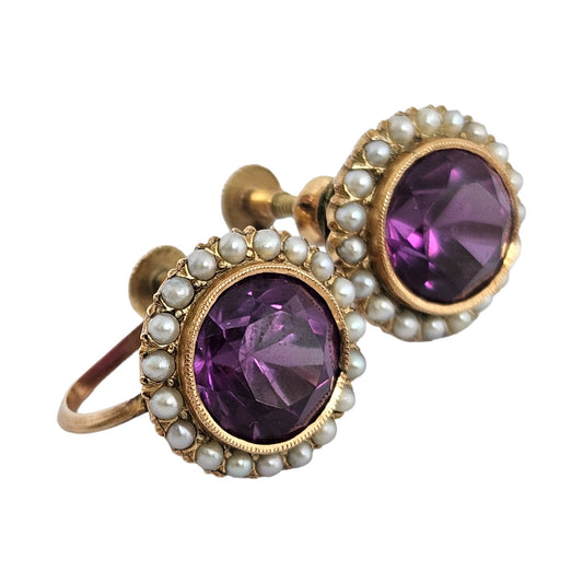 Pair of 14ct Yellow Gold Screw Back Earrings with Synthetic Alexandrites & Pearls 6.0 g