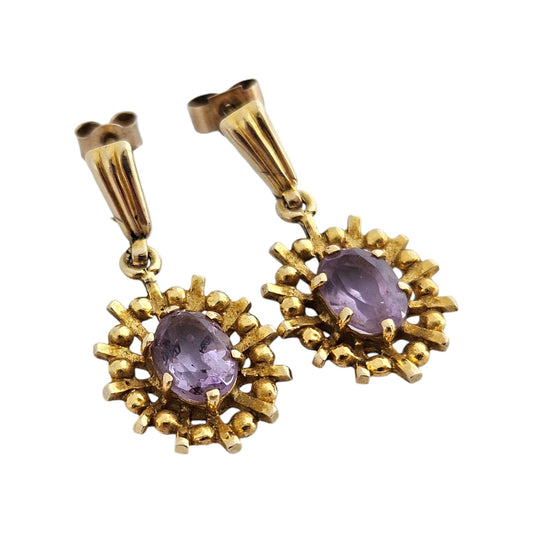 Pair of 9ct 375 Yellow Gold & Amethyst Ear Drops c.1970's L 2.3 cm 2.7 g