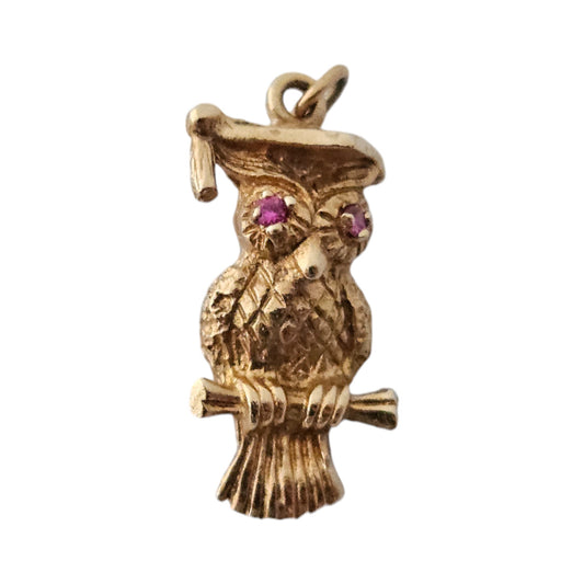 9ct 375 Yellow Gold Owl Charm with Red Eyes 1975 L 1.8 cm 2.3 g.