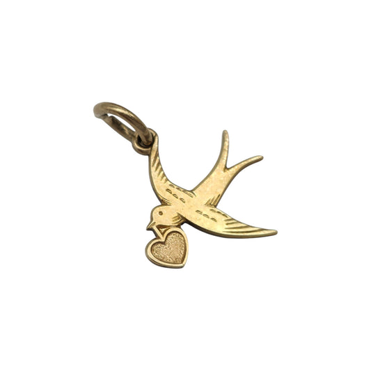 9ct 375 Yellow Gold Swallow With Heart Charm 1977 L 1.3 cm 0.6 g.
