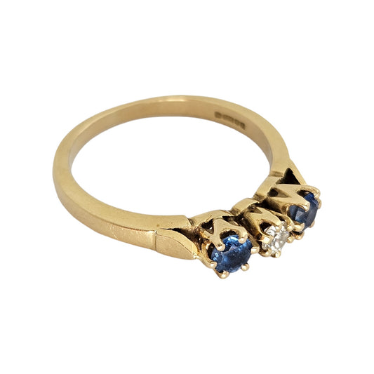 18ct 750 Yellow Gold Three Stone Sapphire & Diamond Ring 1984 Size Q 4.1 g
