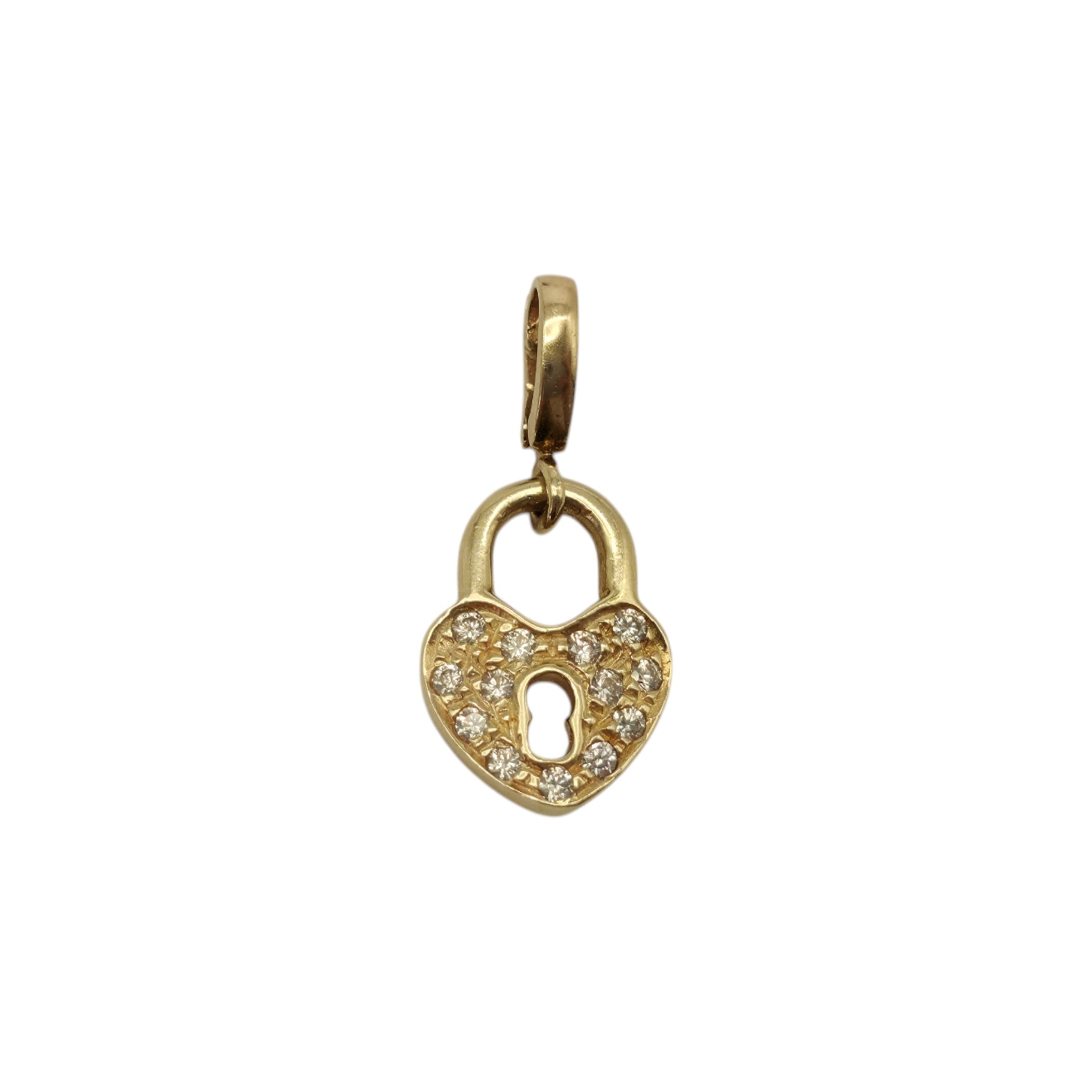 We are selling a pre-owned 14ct gold Heart Shaped Padlock Charm set with paste stones.