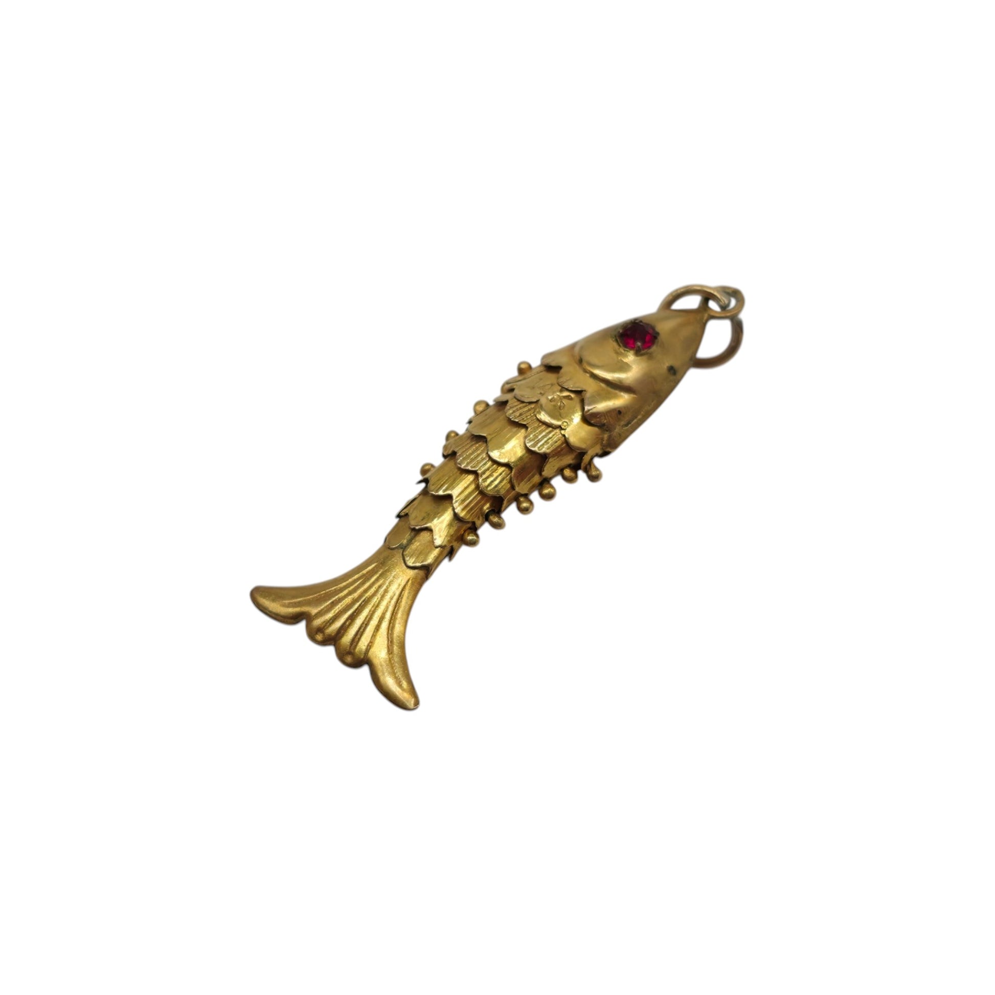 We are selling a pre-owned 14ct gold Articulated Fish Charm with red stone eyes.