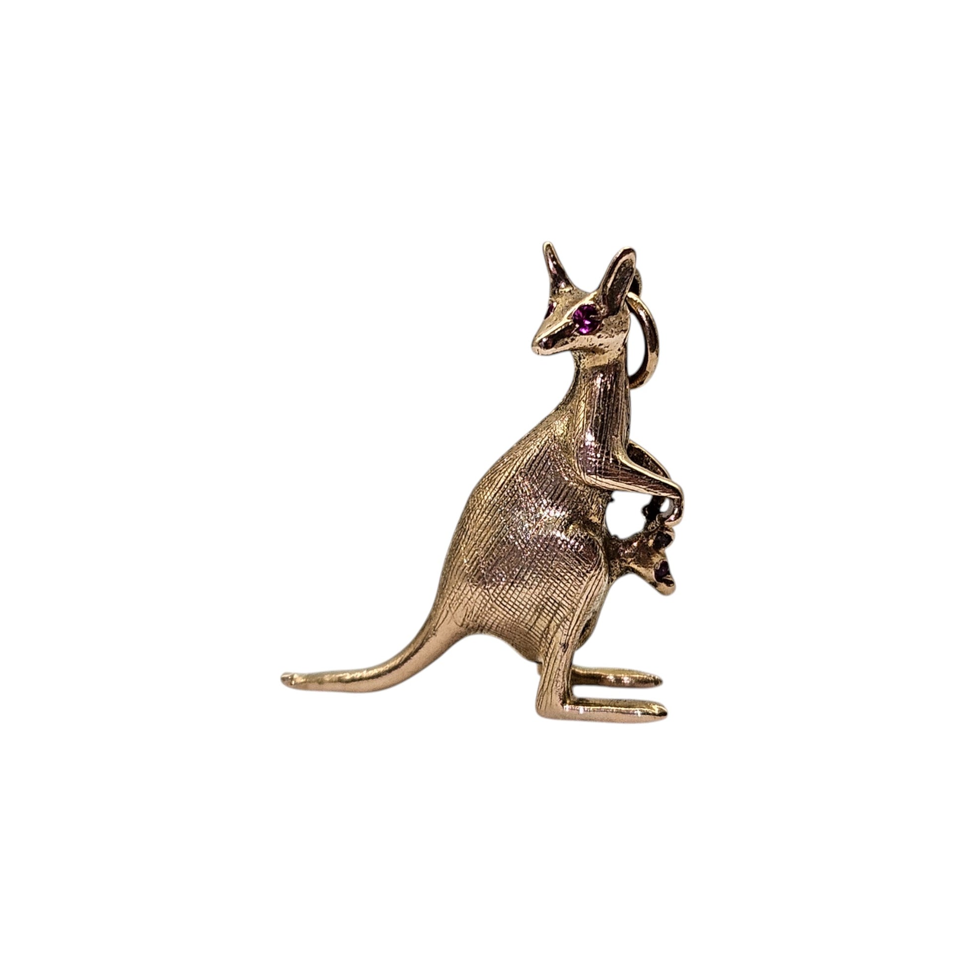 We are selling a cast 9ct gold Kangaroo & Joey Charm, both the red stone eys.
