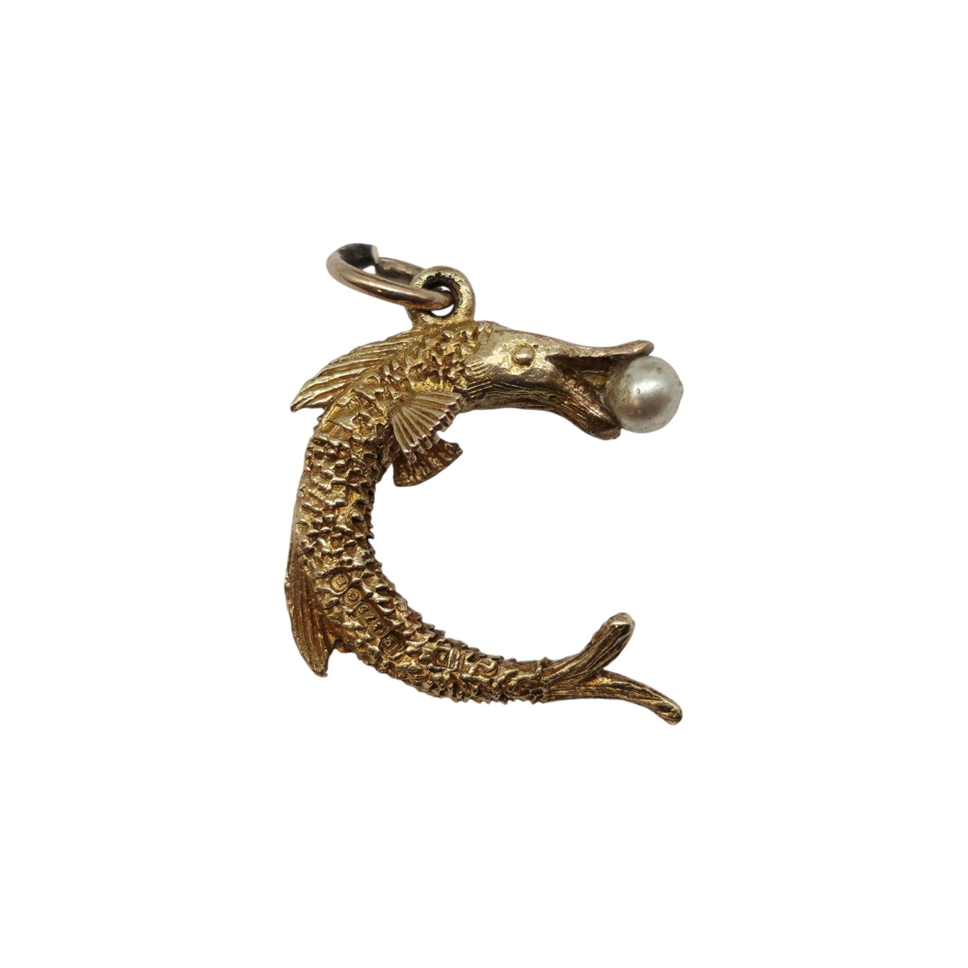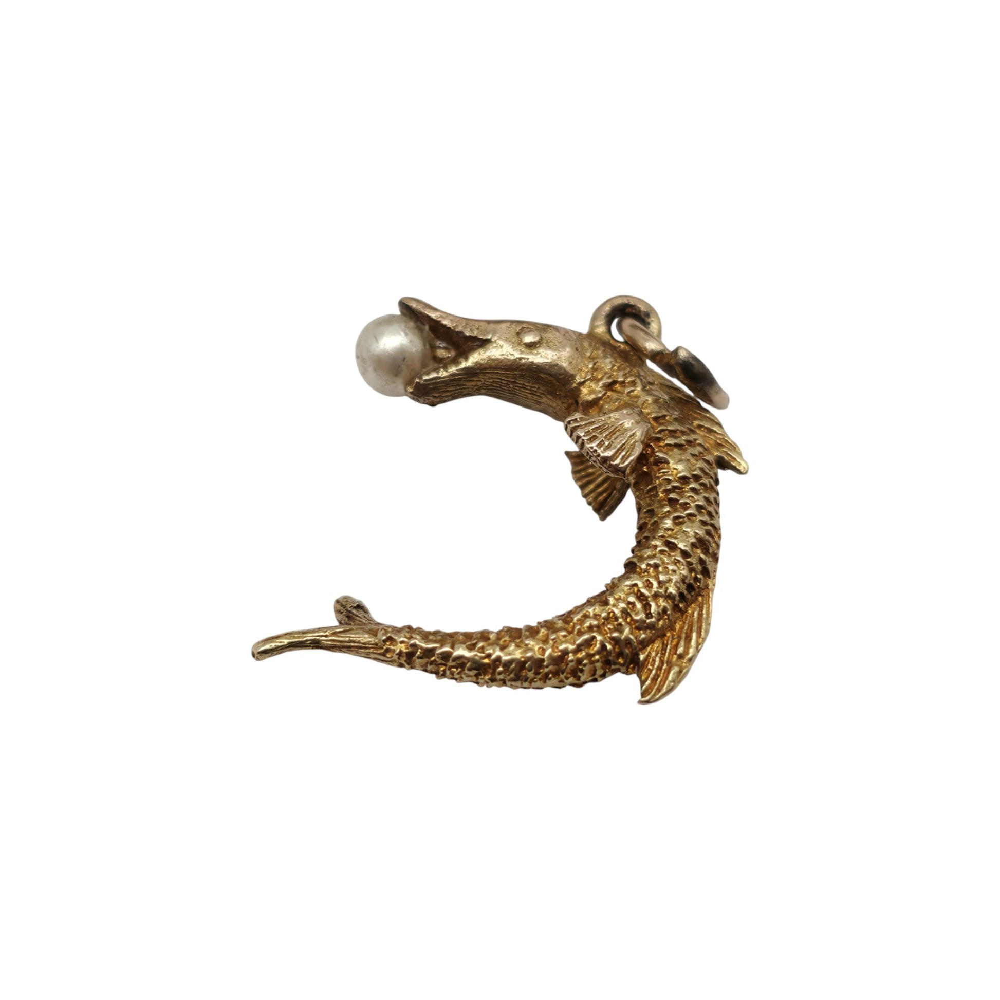 We are selling a pre-owned 9ct gold Pike Fish Charm set with a Faux Pearl.