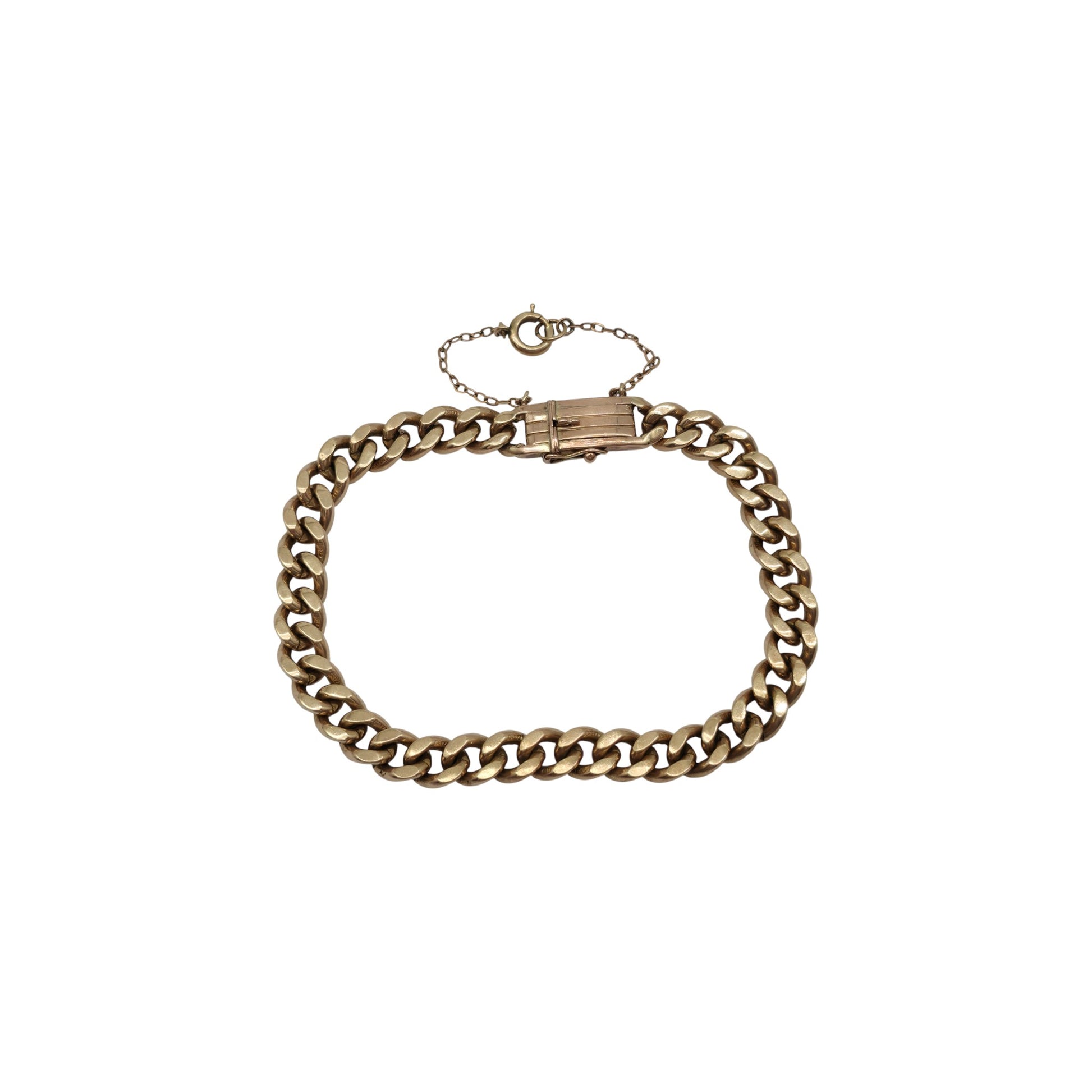 We are selling a pre-owned antique solid 9ct gold Curb Link Bracelet with unusual clasp and safety chain.